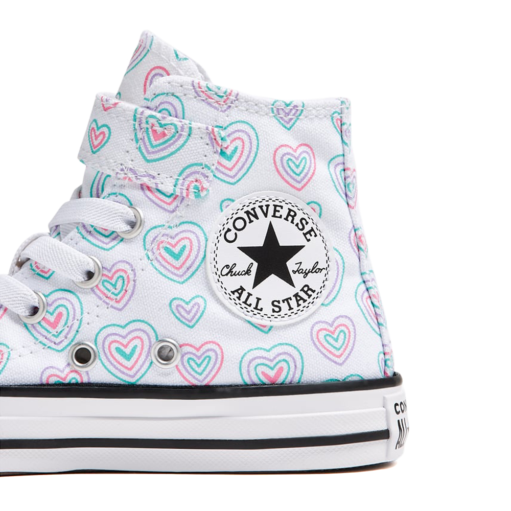 Veseli dizajn na Converse Chuck Taylor All Star high-top patikama dolazi sa visokim profilom, podesivom čičak trakom oko članka, pertlanjem, izdržljivim platnenim gornjištem i gumeniim đonom.
