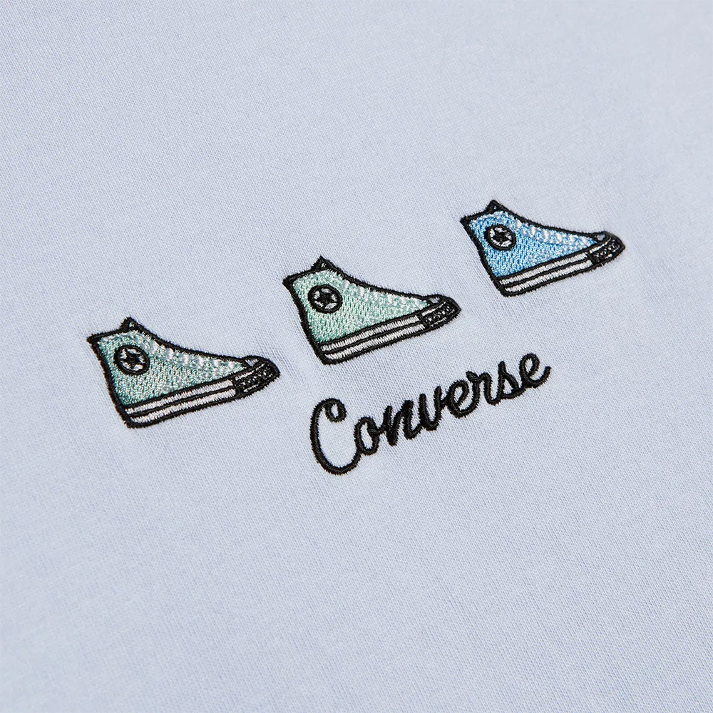 Ova Converse majica napravljena za fanove Chuck Taylora, od fanova Chuck Taylora – predstavlja nasleđe sa tri izvezena Chuck Taylor patika istaknuta na prednjem delu.
