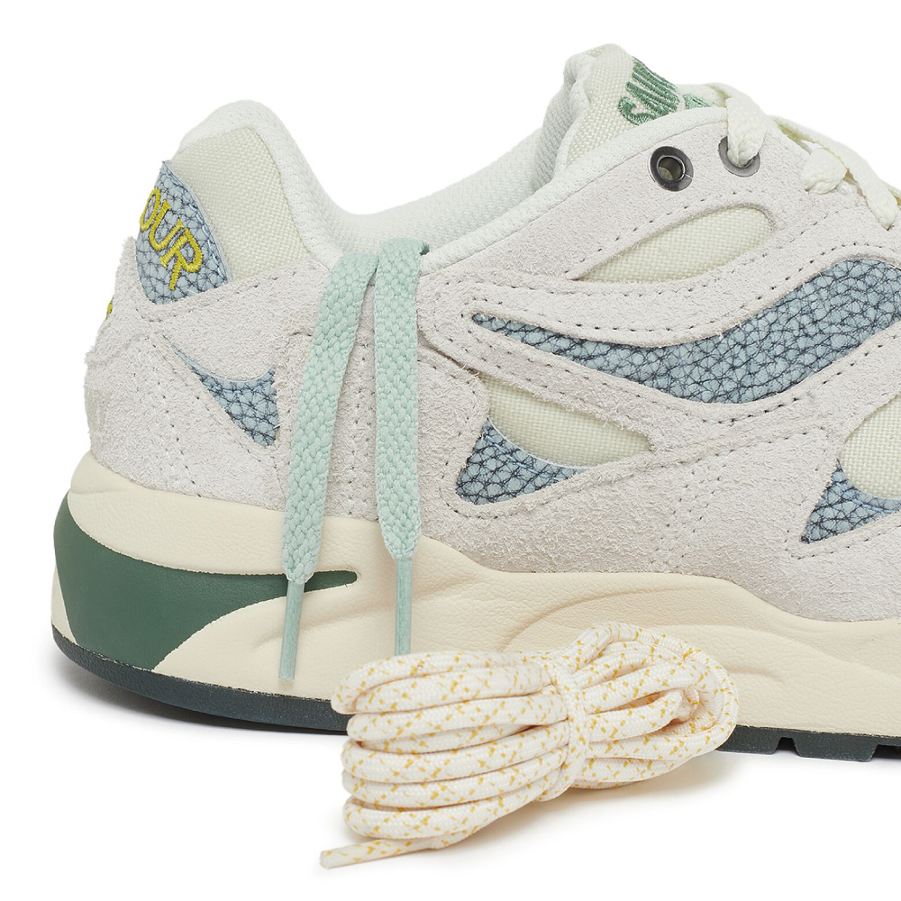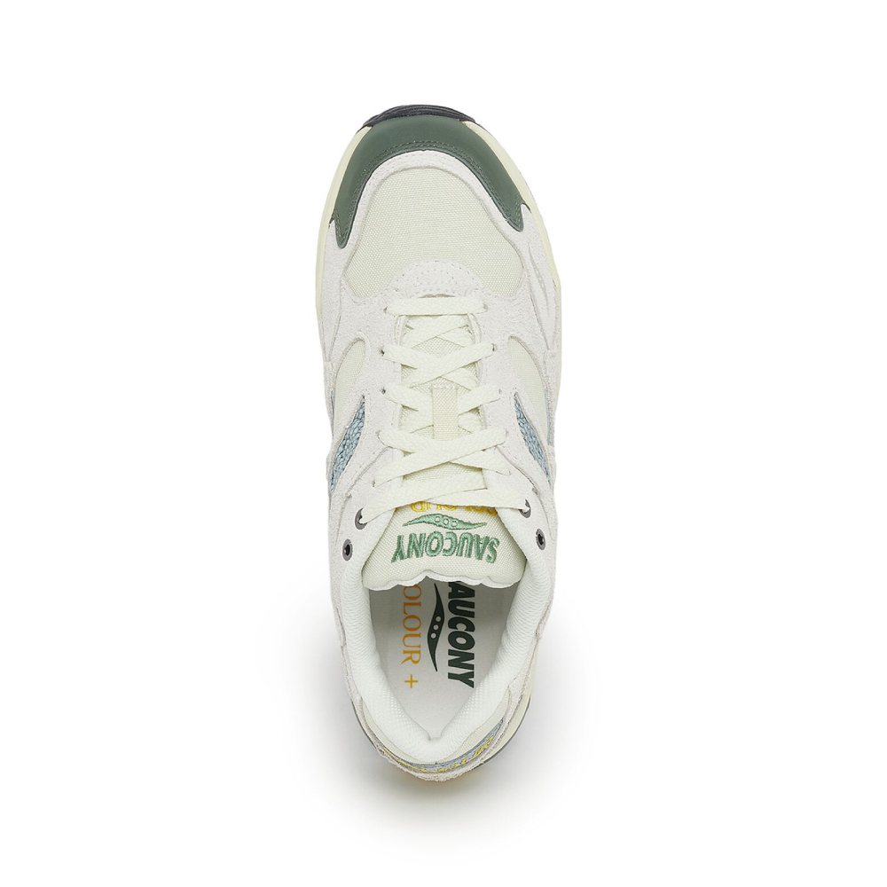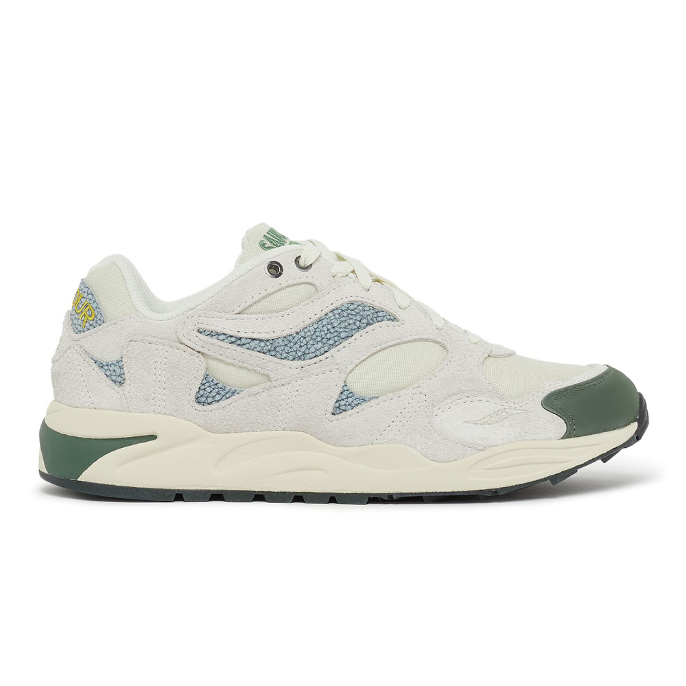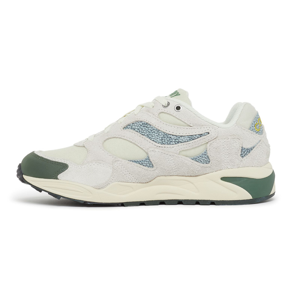 Saucony X Colour Plus Companie Grid Shadow 2 karakteriše gornjište od krem-smeđe prevrnute kože sa zelenim i plavim detaljima, kao i logo vez na jeziku i delu pete. Razvijen za aktivnosti na otvorenom.