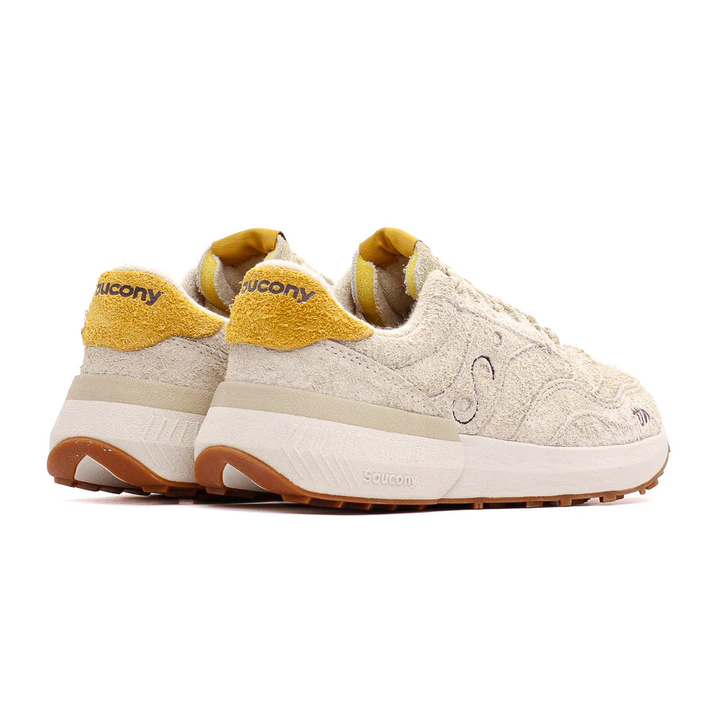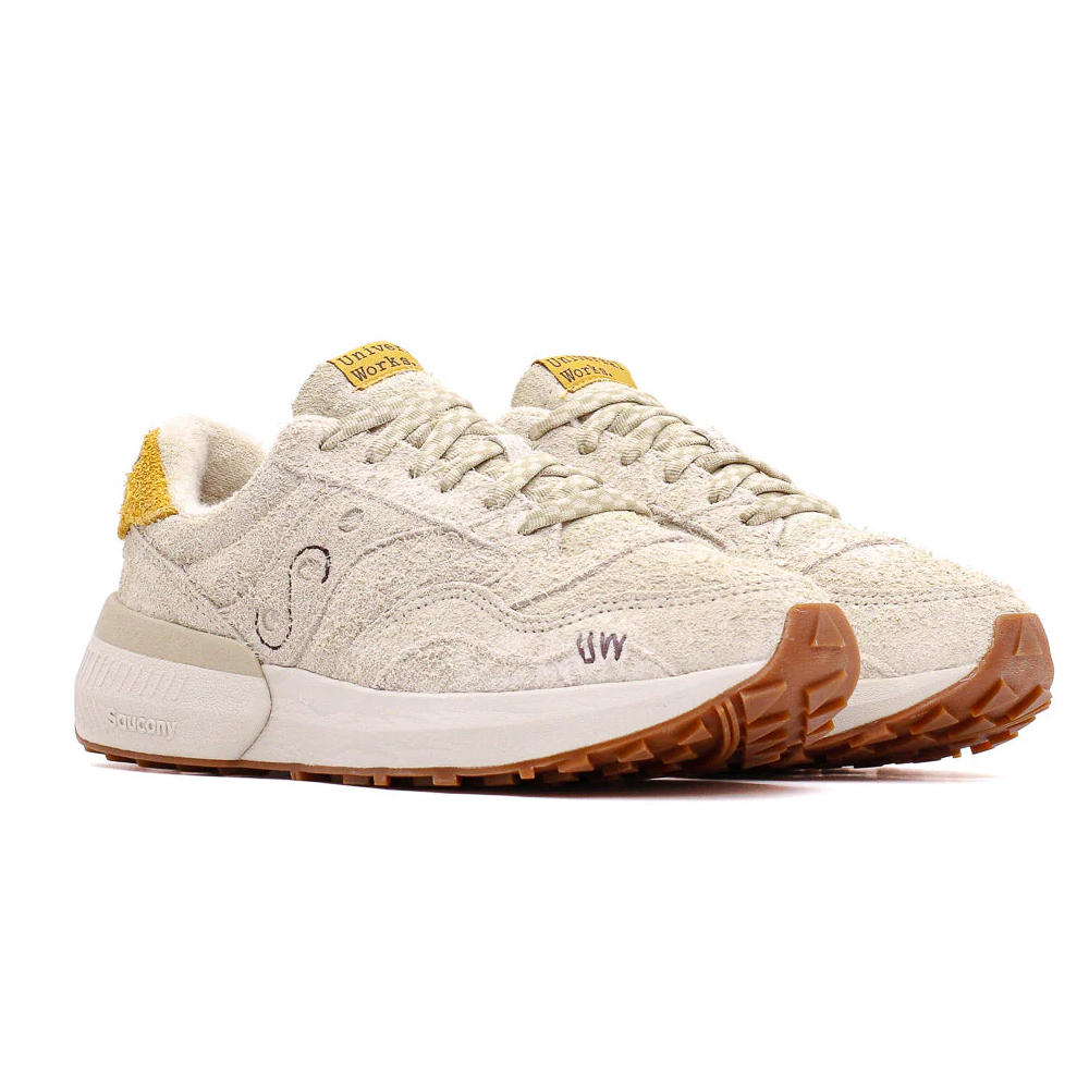 Sa đonom u istoj boji kao i kao i gornjište, stvara se doživljaj dinamične uniformnosti. Detalji su pažljivo promišljeni, pri čemu šavovi dodaju poseban pečat Saucony logotipu, Universal Works etiketa obogaćuje jezik patike, dok se ručno izrađeni UW motiv pojavljuje na vrhu cipele. Sve ovo upotpunjeno je premium uloškom sa prilagođenim brendingom.